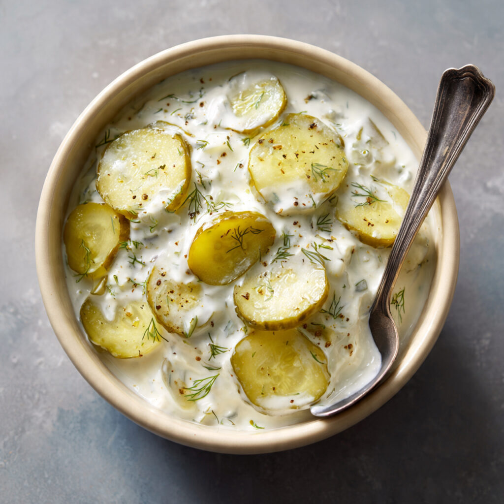 In a small bowl, combine ranch seasoning, Greek yogurt (or sour cream), dried dill, sliced pickles, and pickle juice. Mix until smooth and well blended.