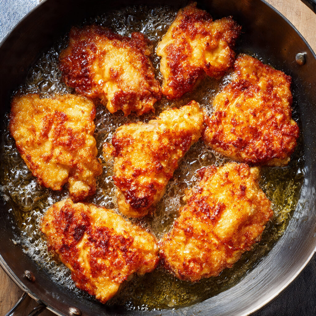 Cook the chicken in batches for 4–5 minutes per side until golden brown and crispy. Remove and place on paper towels to drain excess oil.