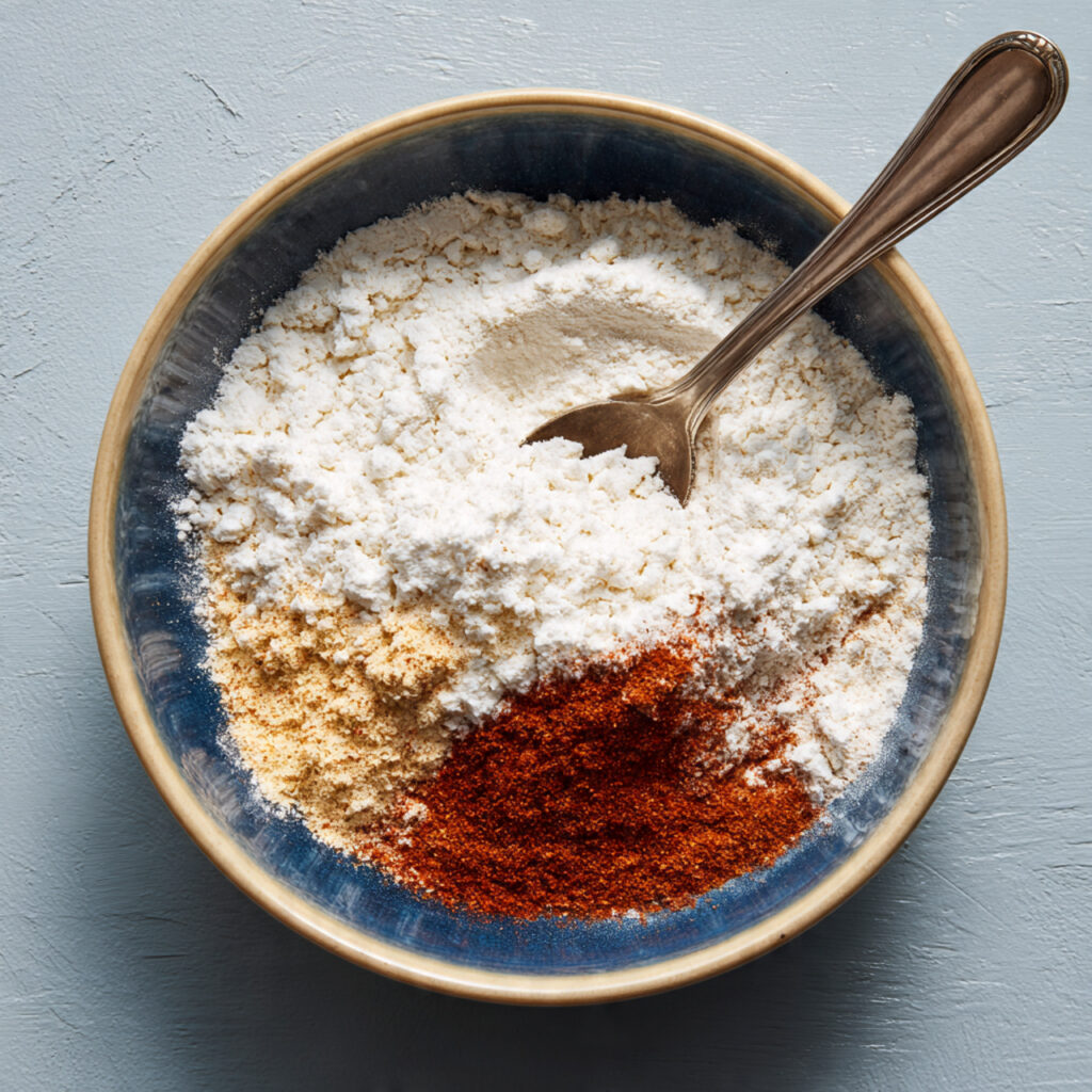 In a shallow bowl, combine the flour, salt, black pepper, garlic powder, and smoked paprika. Mix well to create a flavorful coating.