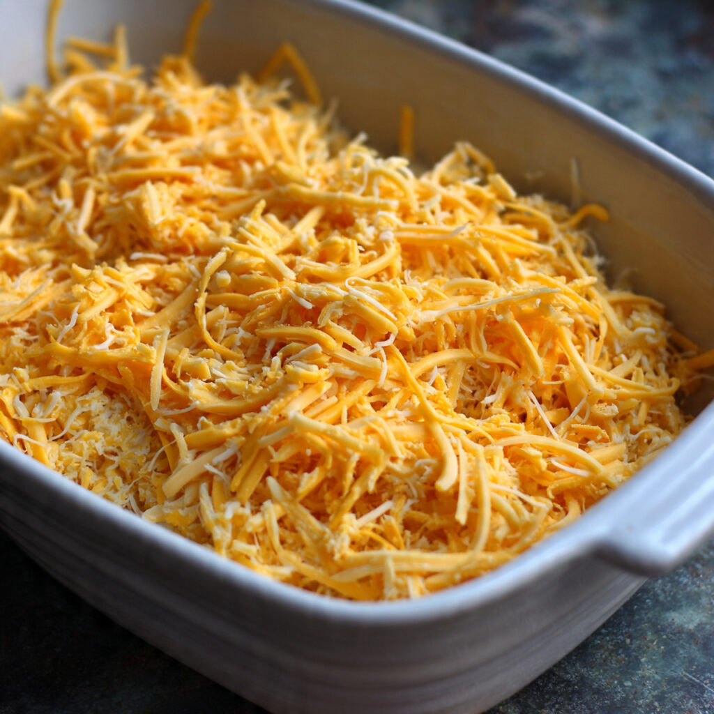 Stir in the shredded cheddar and Parmesan cheese. This gives the casserole its rich, cheesy flavor.